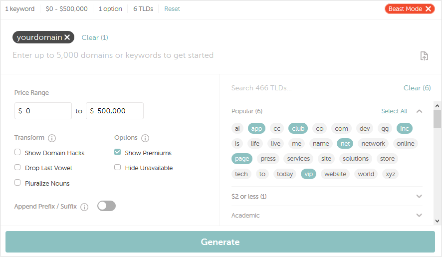 So, what is Beast Mode and how does it differ from Namecheap's regular Domain Name Search? With the regular domain search, you will search for one domain name and a list of available options related to your search will be displayed. With Beast Mode you can search for up to 5,000 domains and keywords at a time and have numerous filter options.